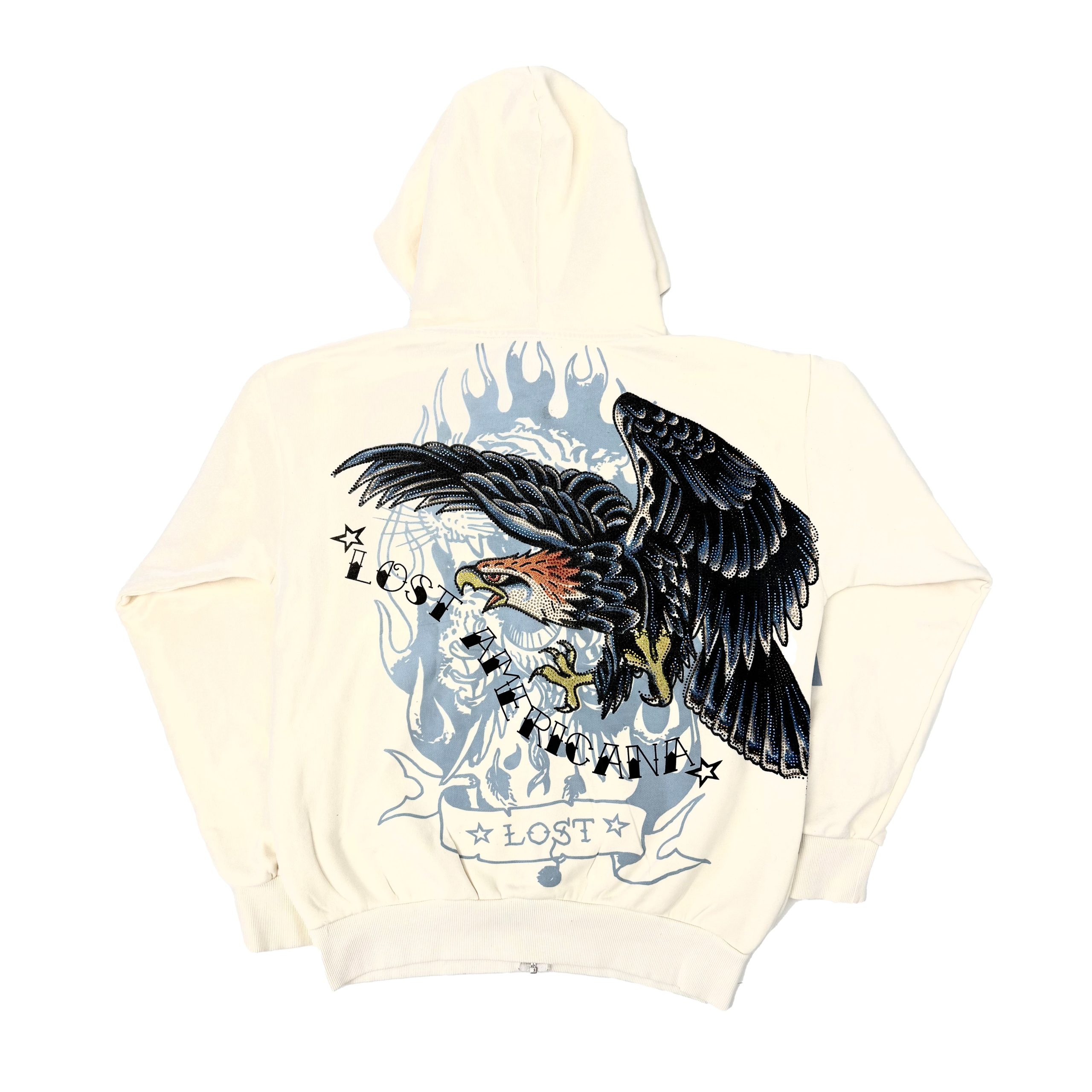 This MGK x Ed Hardy hoodie is heavily embellished and cut from a heavy weight cotton in the shade cream. Features layers of Ed Hardy and MGK logos and complete with iconic Eagle artwork.?