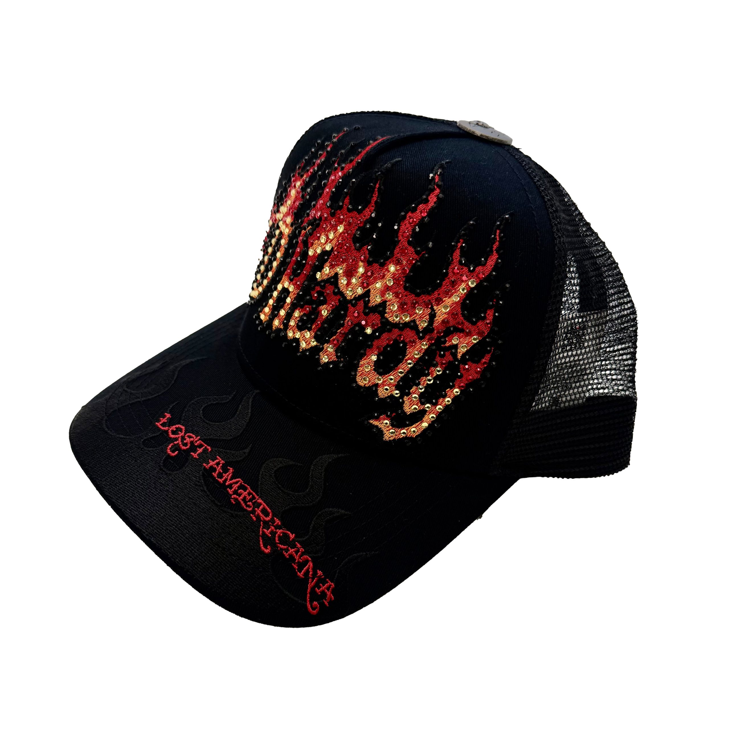 This rhinestone embellished trucker hat features Ed Hardy and MGK logos layered over flame graphics. Complete with a mesh snap back and curved brim.
