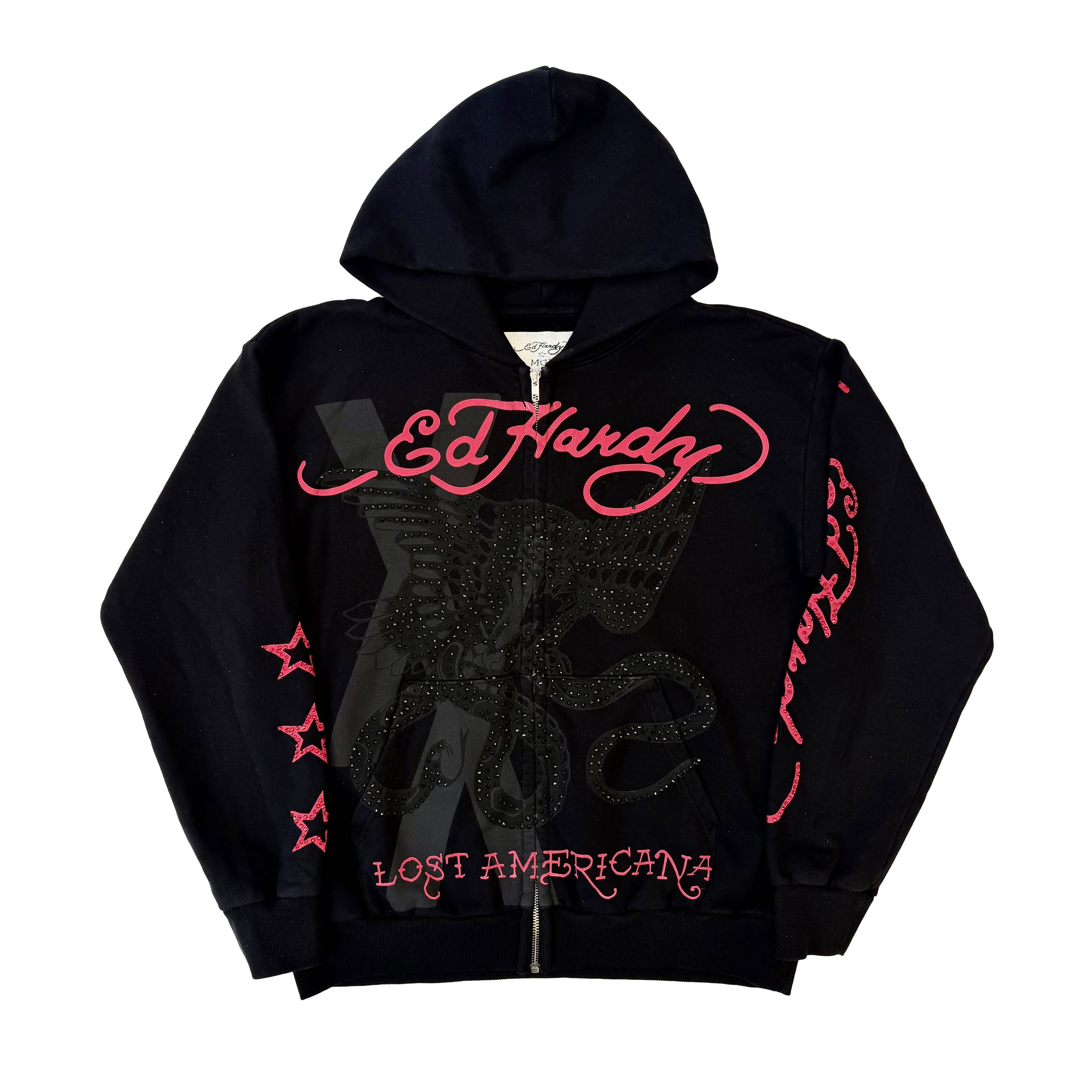 This MGK x Ed Hardy hoodie is heavily embellished and cut from a heavy weight cotton in the shade vintage black. Features layers of Ed Hardy and MGK logos and graphics on the front. and complete with flames and Smoking Kills on the back.