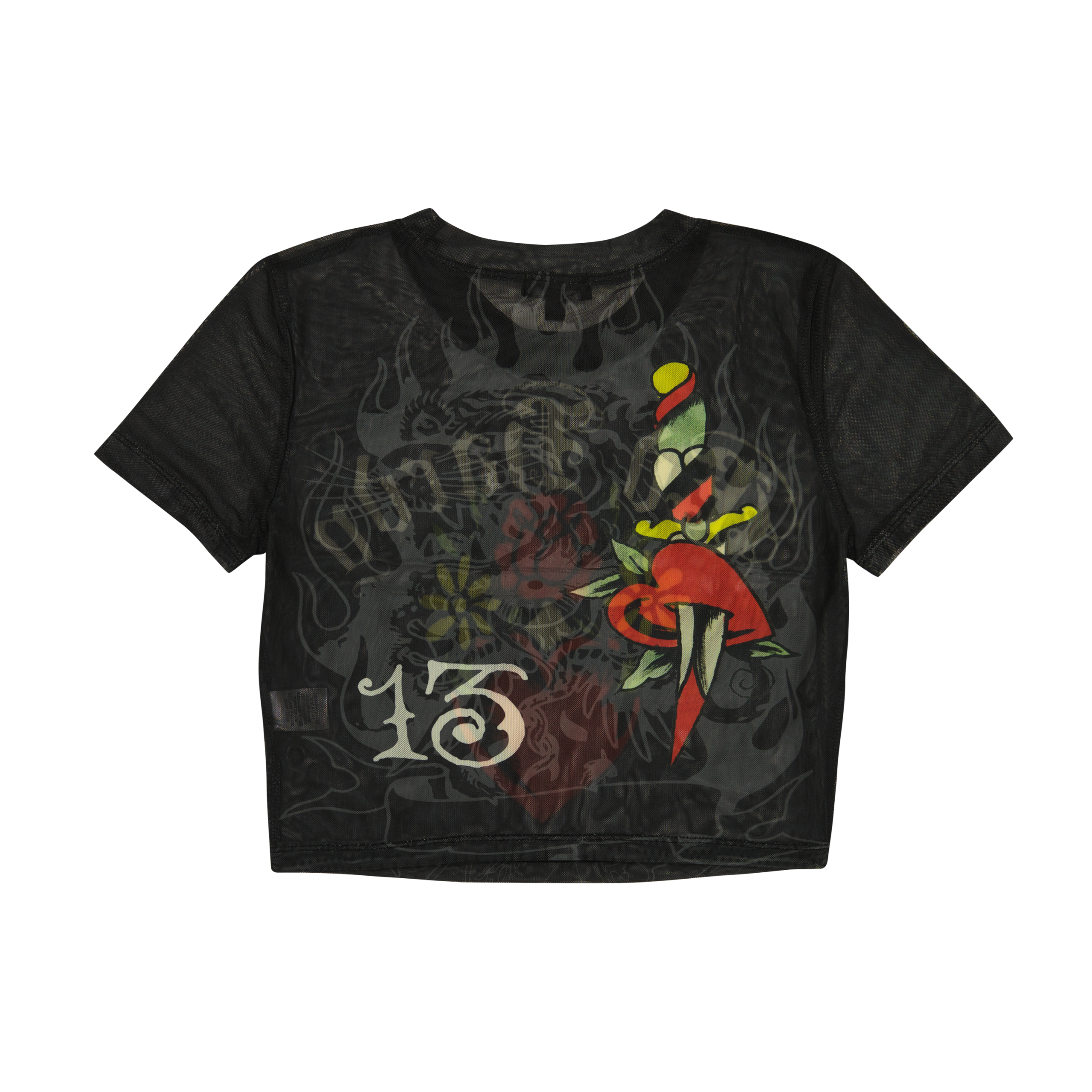 This mesh take on our classic cropped baby tee features layered archival graphics and a signature Ed Hardy logo.