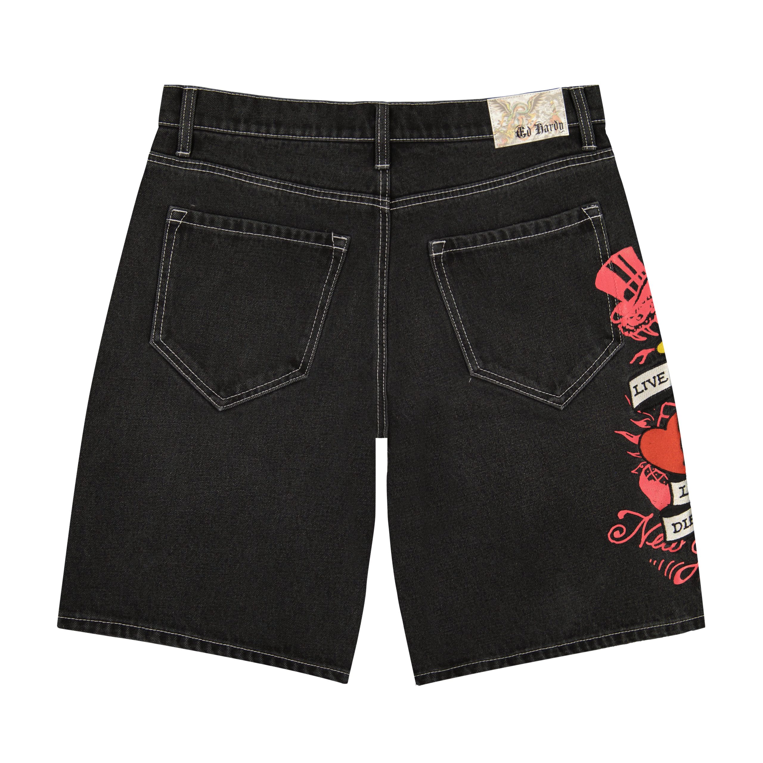 Jorts cut from a Y2K black denim in a baggy fit. Features a live fast skater graphic and Old English logo on the side in white.