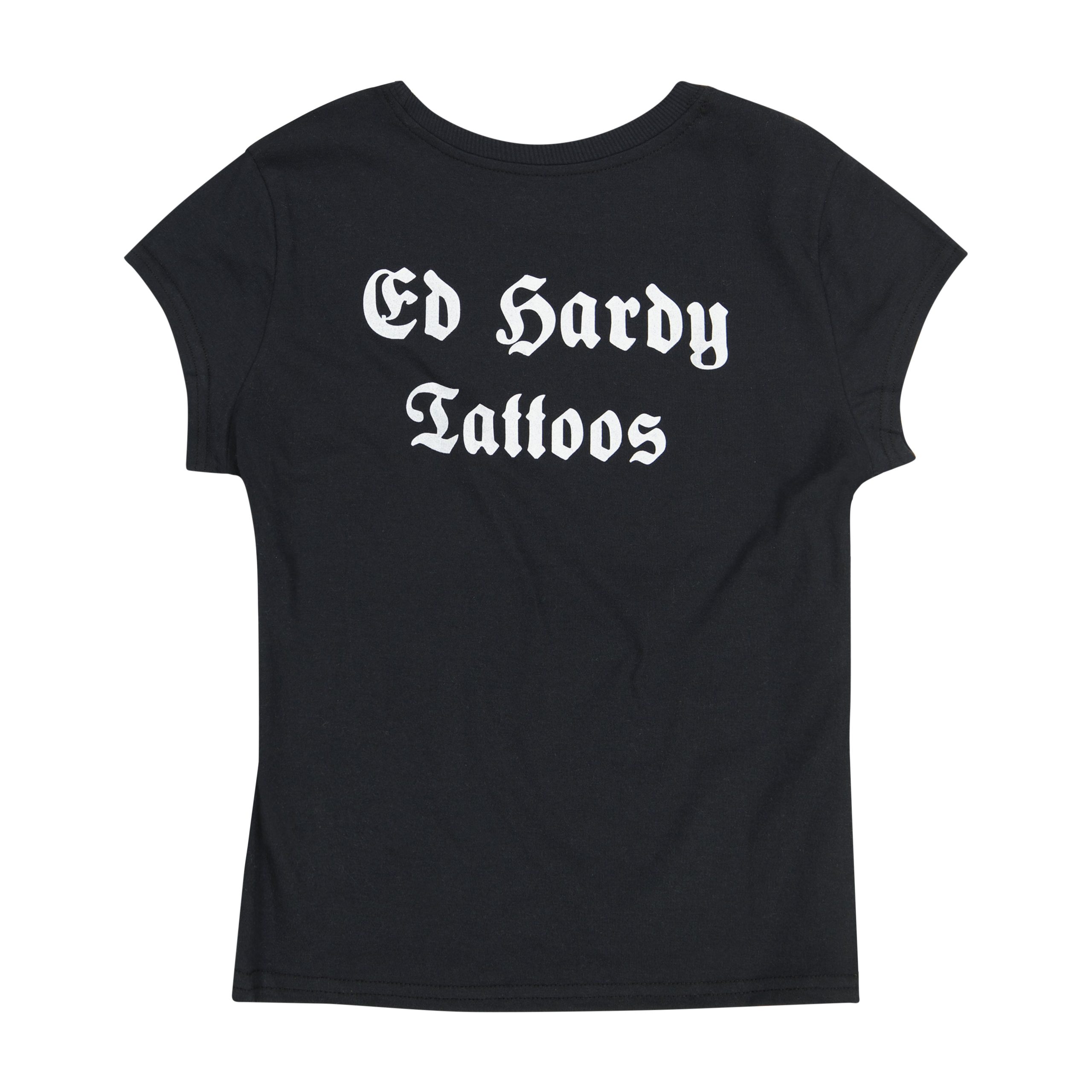 Cap sleeve fitted tee cropped at the waist. Complete with a signature Ed Hardy NYC graphic and several archival logos.